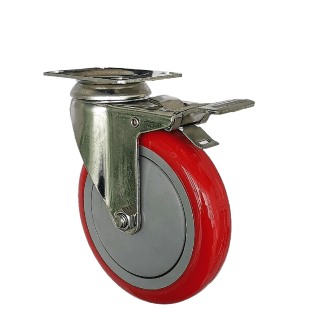 Poliuretano DRGL INOX 5", herraje acero inoxidable, placa, giratoria, freno total frontal